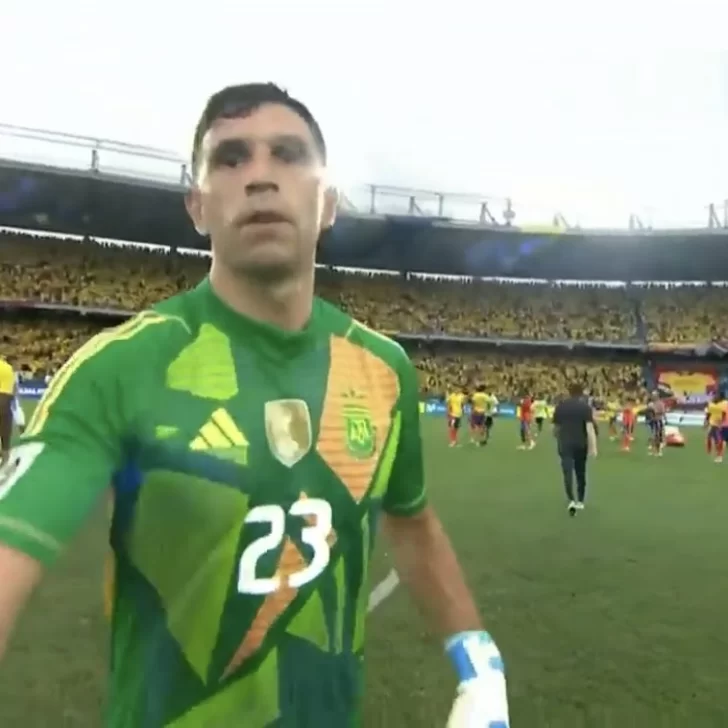 En el final del partido, mientras varios jugadores reclamaban al árbitro Piero Maza -quien cobró un polémico penal para Colombia, las cámaras de la transmisión oficial capturaron el momento en el que Dibu, tras despedirse de buena manera de Jhon Durán, toma de mala manera la aparición de una cámara frente a su rostro.