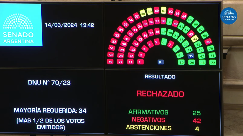 El Senado rechazó por primera vez en la historia un DNU, fue por 42 votos en contra y 25 a favor. Se trata del primer traspié en medición de fuerzas a través del voto parlamentario. Sin embargo, las reformas del decreto continúan vigentes, a la espera del tratamiento en Diputados. Si el Gobierno consigue mayoría en la Cámara Baja, el DNU seguirá siendo válido.
