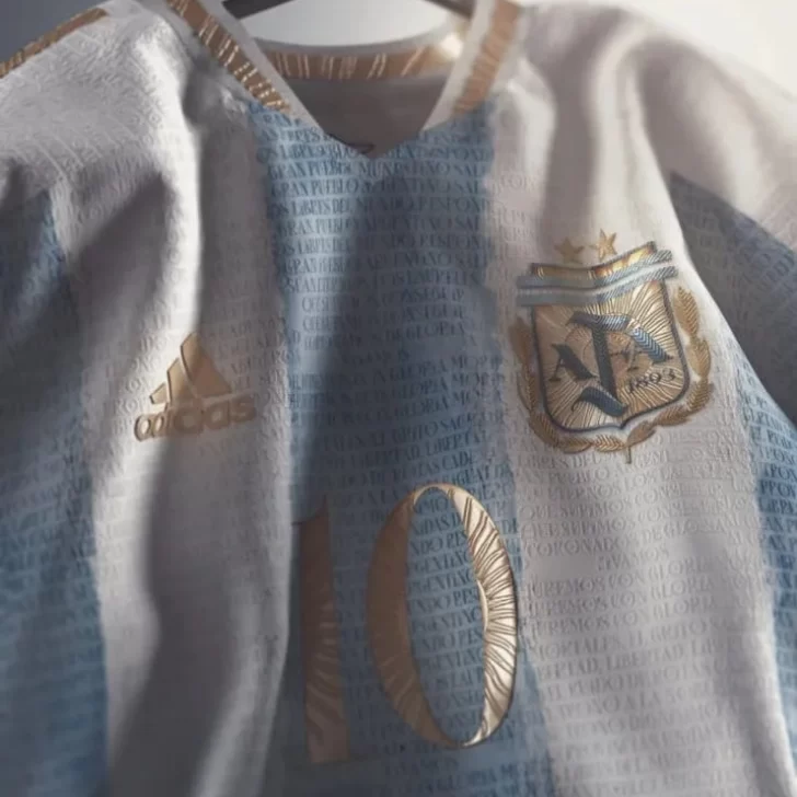 La camiseta presentada por Soccept respeta los dos bastones blancos y el fondo de celeste. No obstante, su diseño tiene un nivel de complejidad increíble. Uno de ellos es el relieve que tiene en toda la tela, donde se lee la letra del himno nacional en mayúscula, y además cuenta con la imagen de Diego bordada en uno de sus costados inferiores.