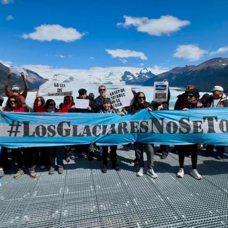 Este miércoles, vecinos autoconvocados y organizaciones ambientalistas se hicieron presentes en las escalinatas del glaciar Perito Moreno para reclamar por la modificación de la ley de glaciares, que fue incluida por el gobierno nacional en la agenda de las sesiones extraordinarias de este mes de febrero. “𝗡𝗼 𝘀𝗲 𝘁𝗼𝗰𝗮𝗻… 𝗹𝗼𝘀 𝗴𝗹𝗮𝗰𝗶𝗮𝗿𝗲𝘀 𝗻𝗼 𝘀𝗲 𝘁𝗼𝗰𝗮𝗻”, fue uno de los cánticos, según dio a conocer el medio Señal Calafate.