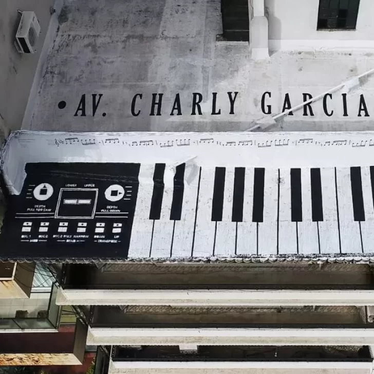 Tian Firpo, que inmortalizó los retratos de numerosos cantantes argentinos en las persianas de comercios del barrio de Palermo, se dedicó de lleno a este gigantesco trabajo que mide unos 9 x 7 metros y que además del teclado, en el dibujo se ve una partitura con los acordes del tema y la inscripción “Avenida Charly García”.