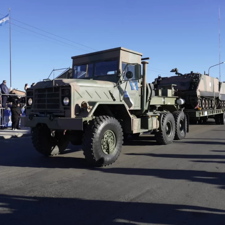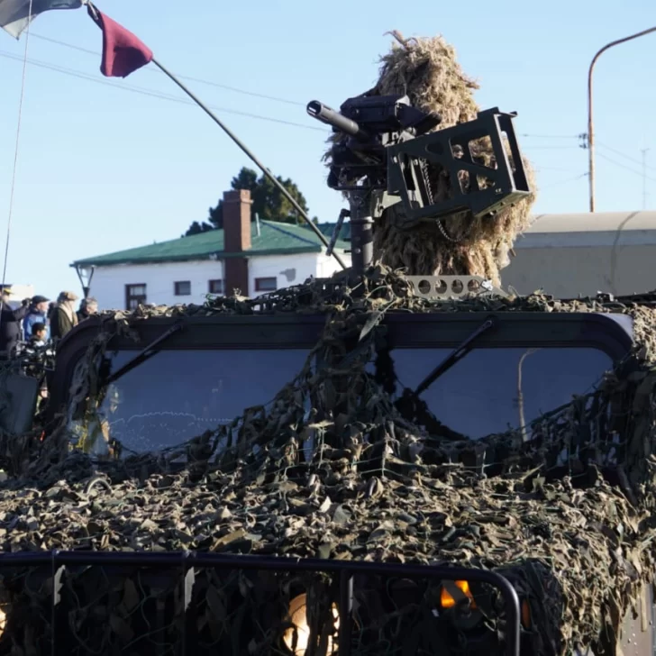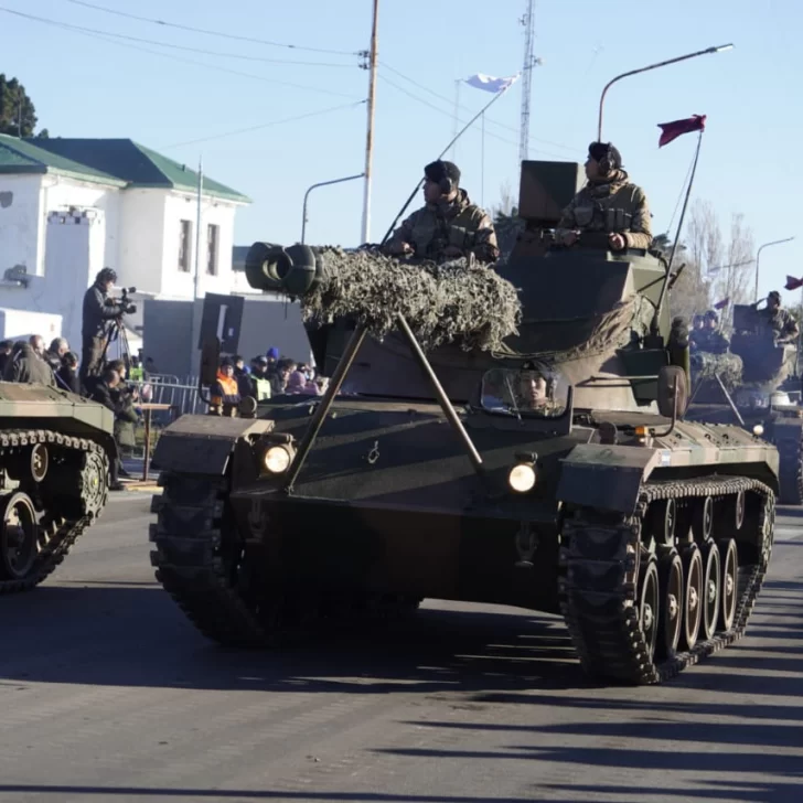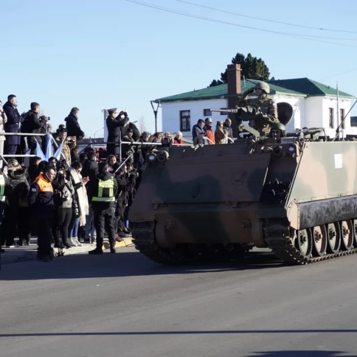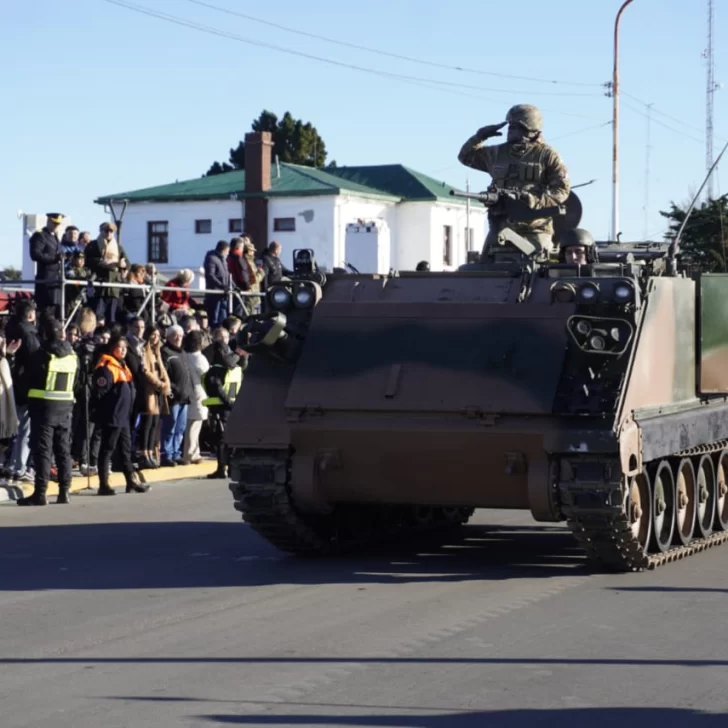Tras el izamiento y la ceremonia religiosa con los representantes de la iglesia católica y evangélica, el gobernador Claudio Vidal junto con el jefe el Ejercito de Río Gallegos, Gustavo Sivori, se subieron a un jeep militar y realizaron un “paso de revista” desde el palco oficial hasta los tanque de YPF, todo por la costanera y regresaron para dar inicio al desfile.