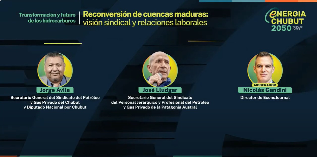 En el marco del Foro Chubut Energía 2050, los referentes sindicales Jorge “Loma” Ávila (sindicato de Petroleros Privados de Chubut y diputado nacional), y José Lludgar (Petroleros Jerárquicos de la Patagonia Austral), encabezaron el panel “Transformación y futuro de los hidrocarburos, reconversión de cuencas maduras”, con la moderación del periodista Nicolás Gandini.