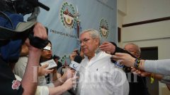 Pablo Grasso junto a Silvio Escobar y José Luis Gómez en el acceso de Casa de Gobierno de Santa Cruz.