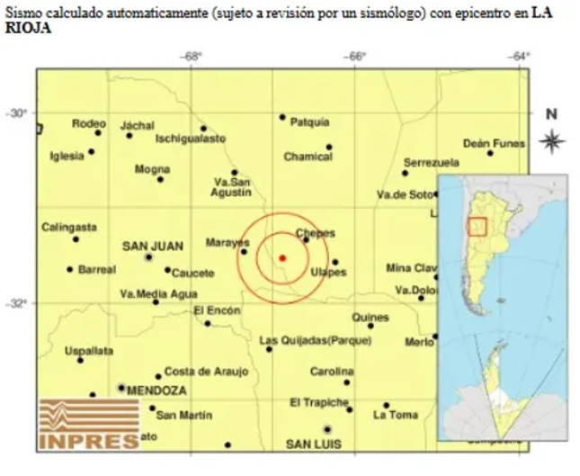 El organismo indicó que el movimiento telúrico ocurrió a las 14.13 de este sábado y se originó a 147 kilómetros de profundidad. El epicentro se ubicó en la localidad de Ulapes, a unos 35 kilómetros de Chepes, en el sur riojano.