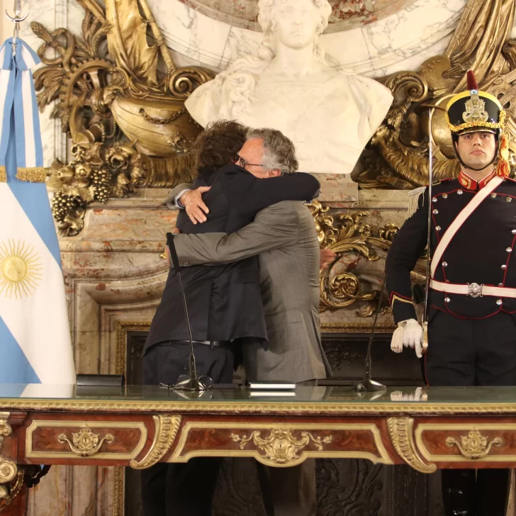 Tras la firma del acta, Lugones y el presidente Javier Milei se fundieron en un abrazo en el Salón Blanco de Casa Rosada. A diferencia de otras juras, esta vez el evento no estuvo cerrado a la prensa acreditada.