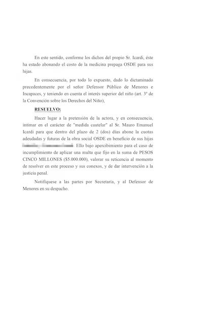 La batalla entre Wanda Nara y Mauro Icardi sumó un nuevo capítulo en la Justicia: el futbolista fue notificado y deberá regularizar, en un plazo de 48 horas, los pagos correspondientes a la obra social de sus hijas; el fallo, firmado por el representante del Ministerio Público de Defensa de Menores, Marcelo Jalil, y notificado al abogado de la empresaria, Nicolás Payarola, indica que, en caso de incumplimiento, se aplicará una multa de $5 millones, se valorará su reticencia como agravante en el proceso y se podría dar intervención a la Justicia penal.