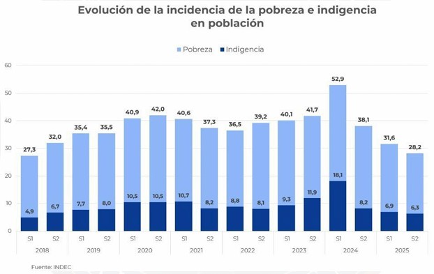 La incidencia de la pobreza marcó también una caída de 3,4 puntos respecto del cálculo anterior, que fue de 31,6% para el primer semestre de 2025. Esta medición es la más baja de los últimos 7 años, desde el primer semestre de 2018, cuando registró 27,3%.