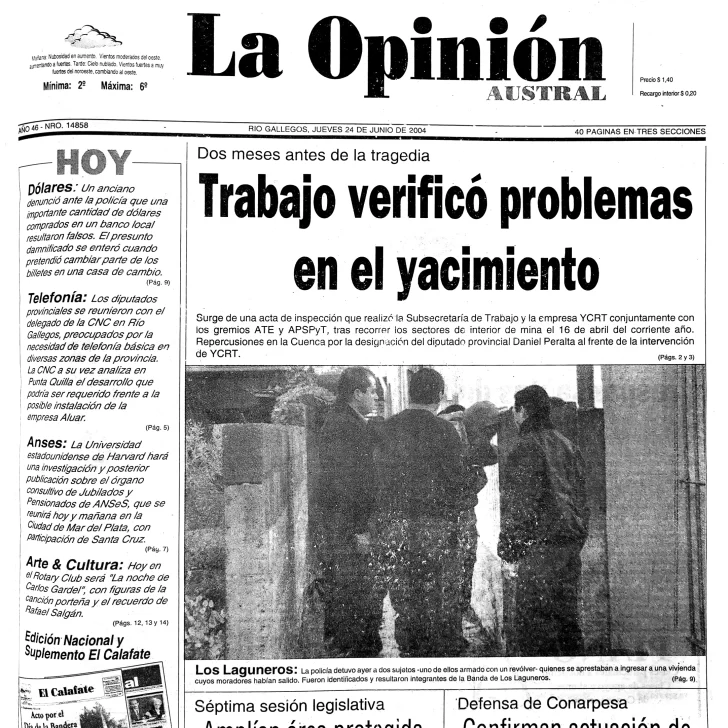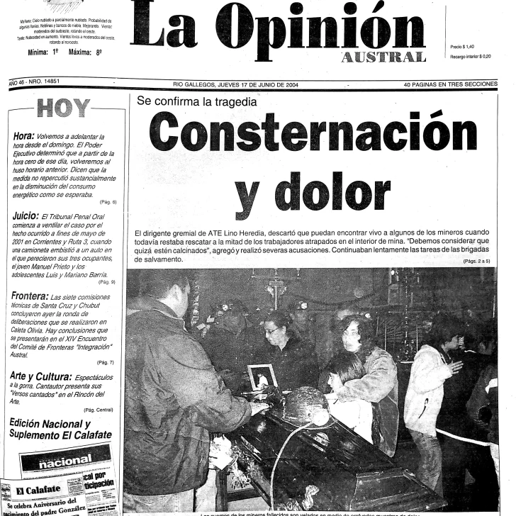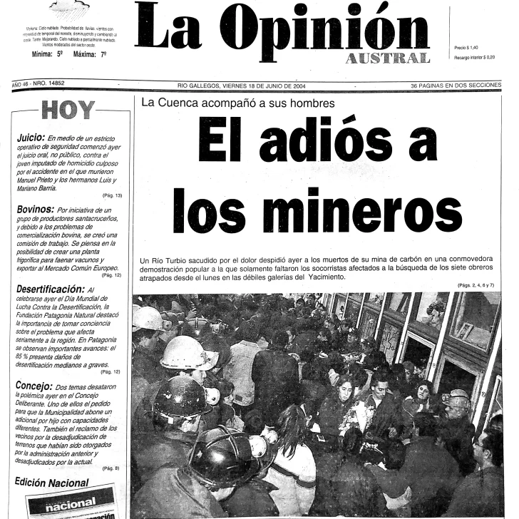 La Opinión Austral cubrió los acontecimientos desde las primeras horas de lo ocurrido. En sus tapas y páginas interiores se puede dimensionar todo lo que estaba ocurriendo. El dolor de las familias y compañeros, la bronca por algo que pudo evitarse, y la resignación cuando comenzaban a llegar las noticias desde el socavón y el hospital distrital.