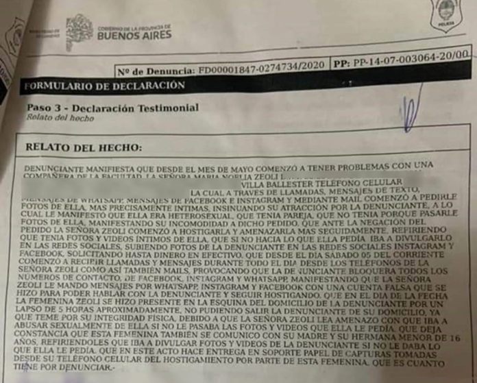 La denuncia está a cargo de la Fiscalía Oeste de Vicente López y el Juzgado de San Isidro, aunque por el momento, según el testimonio de la víctima, está “archivada”.