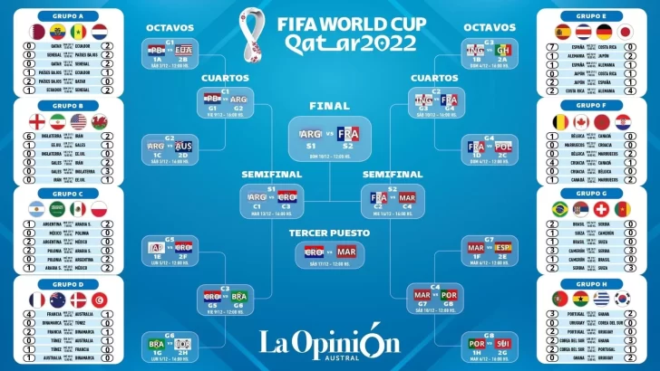 16:00 Francia 2 vs Marruecos 0 (Estadio Al Bayt)