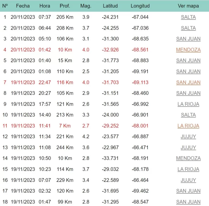 Con respecto a Mendoza, el INPRES informó que el primer sacudón ocurrió a las 10.50 de la mañana del domingo también con una intensidad de 2,8 grados.