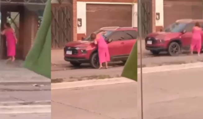 La mujer rodeó una camioneta de color rojo e intentó provocar daños de distintas formas hasta que finalmente golpeó con fuerza el parabrisas, al que le ocasionó varias abolladuras.