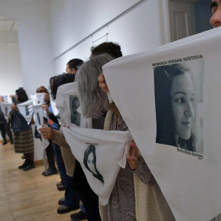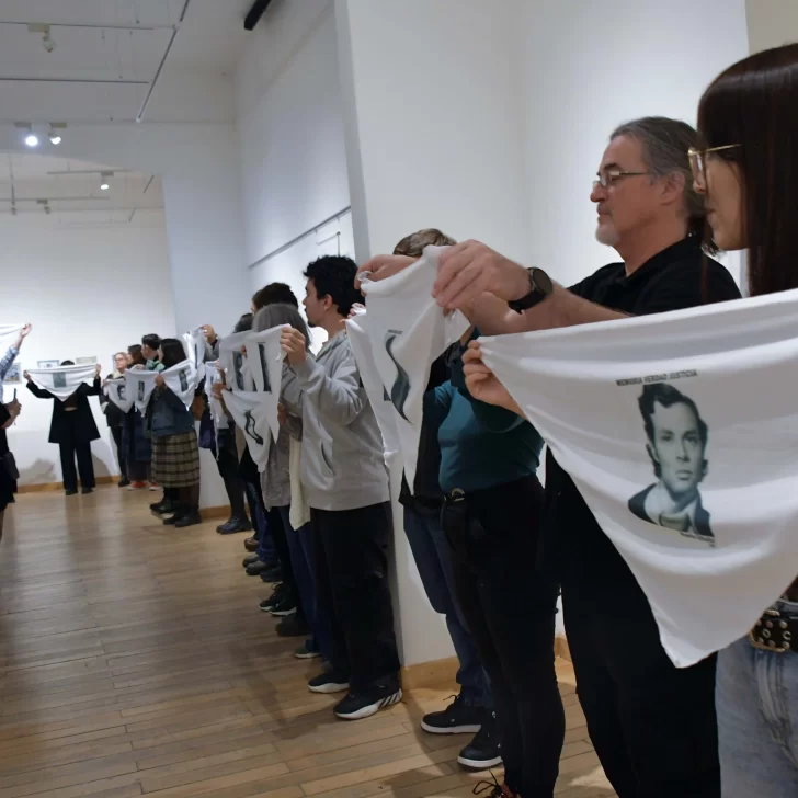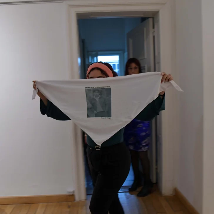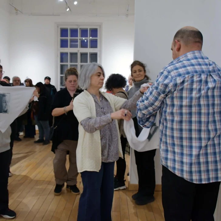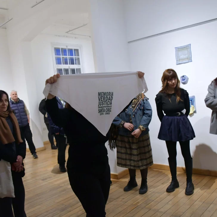 “MEMORIA, VERDAD, JUSTICIA. Desaparecidos en Santa Cruz. 1976-1983”, se lee en el pañuelo blanco que una mujer sostiene extendido y alza mientras camina en el interior del Museo de Arte Eduardo Minnicelli.
