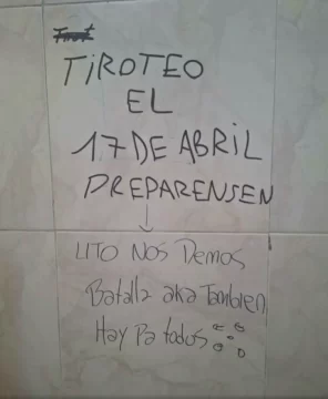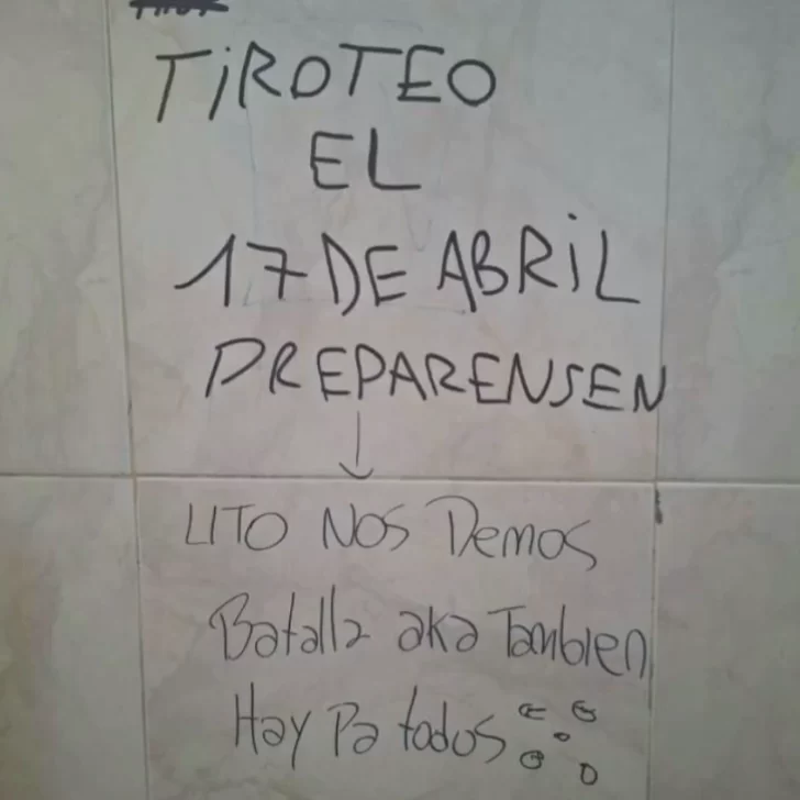 Uno de los mensajes que comenzó a circular decía: “17/4, tiroteo. Último aviso”, sin especificar el lugar. Otro, encontrado en un baño escolar, advertía: “Tiroteo el 17 de abril prepárense. listo nos demos batalla acá también. hay para todos”.