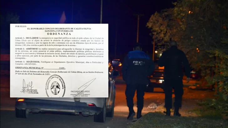 La norma declara la Emergencia en Seguridad Pública por el término de 180 días corridos a partir de su promulgación, abarcando a todo el ejido urbano de Caleta Olivia. El texto fundamenta la decisión en la necesidad de revertir “la situación de peligro colectivo creada por los hechos de inseguridad, violencia y ante los signos de odio y amenazas con uso de diferentes tipos de armas”, una descripción que refleja el clima de inquietud que se vive especialmente durante la nocturnidad en distintos sectores de la ciudad.