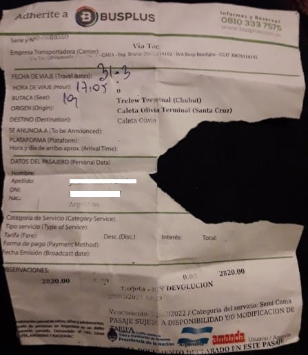 El pasaje de Trelew-Caleta. Una de las pruebas que tiene para el reclamo que elevó a la empresa.
