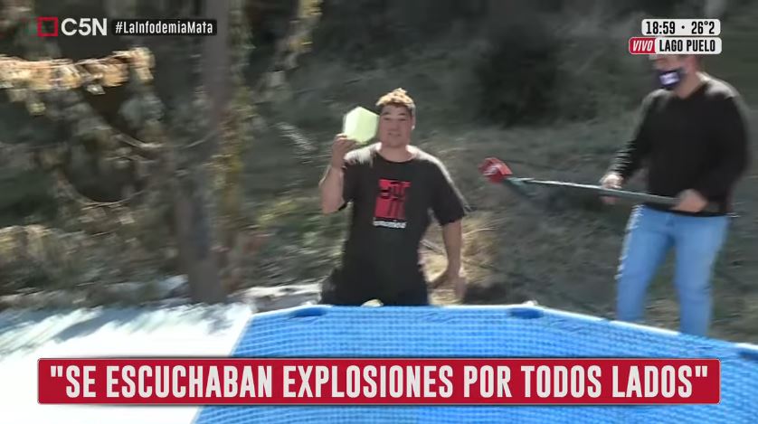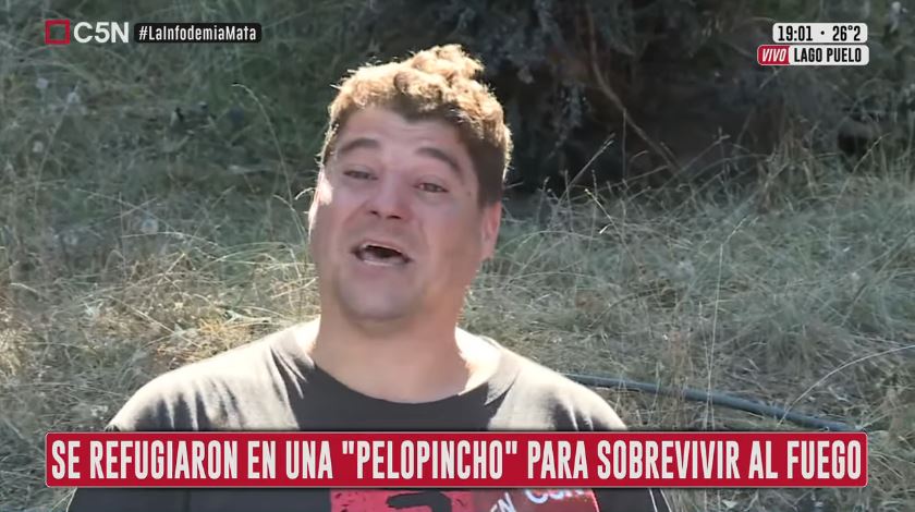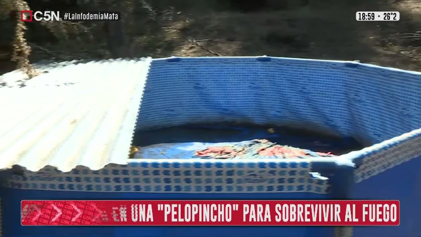 “Cuando calmaba un poco el viento y el fuego, agarraba un tarrito, lo llenaba de agua y lo usaba para tratar de apaciguar el fuego“, indicó el sobreviviente. Además, un árbol de manzana cubrió un poco la cortina de fuego para que no llegara hasta la pileta. “Sentíamos las llamaradas, tocabas el plástico y parecía que se iba a derretir, le tirábamos agua para que no se prenda”, señaló.