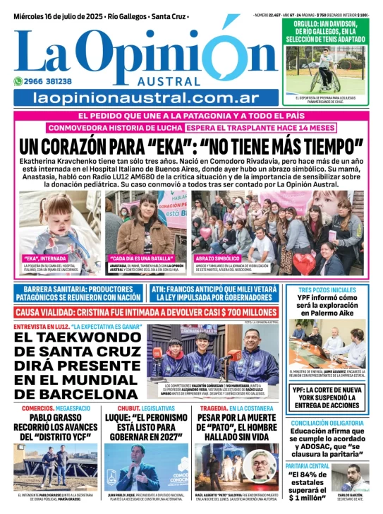 Ekatherina, la niña que conmovió a toda la Patagonia y al país por su incansable espera de un trasplante de corazón, continúa internada en estado crítico en el Hospital Italiano de Buenos Aires. En los últimos días, fue retirada de la lista del INCUCAI luego de sufrir una lesión cerebral, lo que imposibilitó, por ahora, su permanencia como receptora en emergencia nacional.