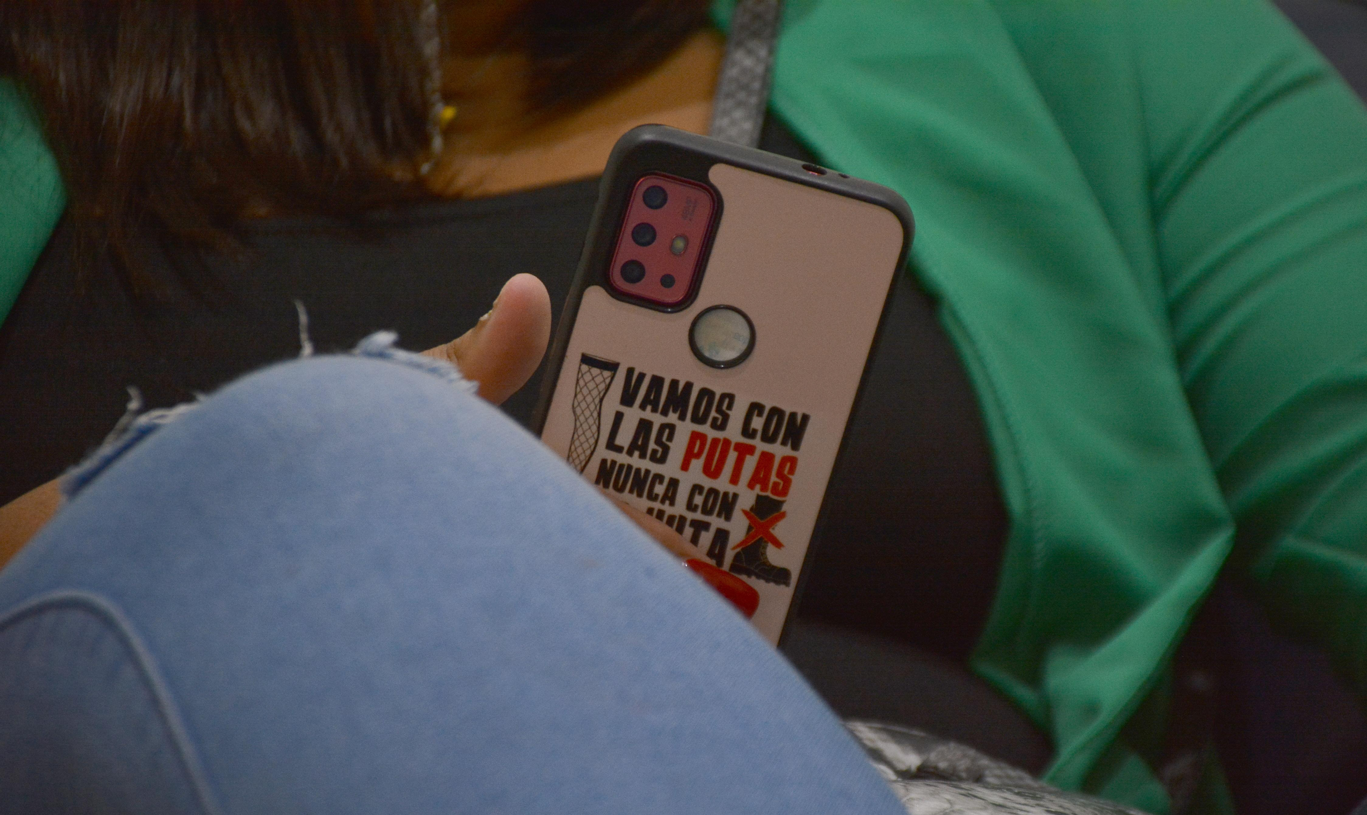 La funda del celular de Georgina refleja: “Vamos con las putas, nunca con la yuta”. FOTO: JOSÉ SILVA / LA OPINIÓN AUSTRAL