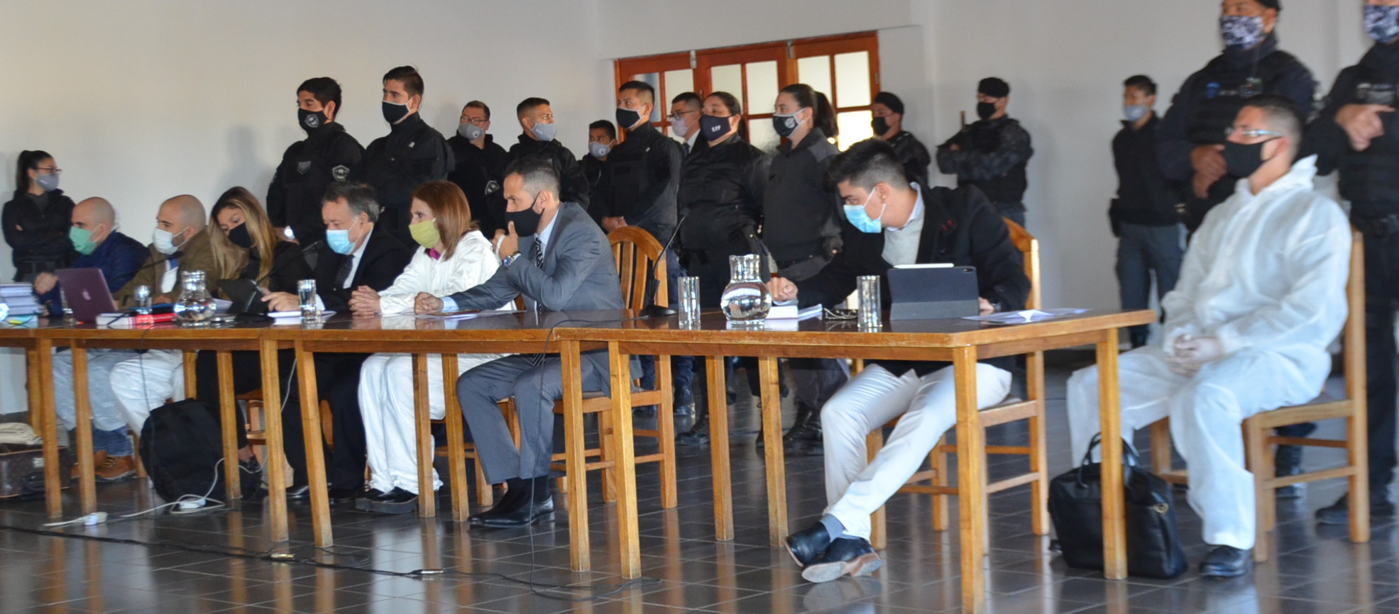 A diferencia de lo que ocurre en el edificio de la Cámara Oral de la calle Malaspina, esta vez los imputados fueron sentados junto a sus abogados (Carlos Telleldín por la familia detenida y Javier Robles por el lado del presunto sicario) del lado izquierdo al tribunal. Detrás de ellos, una quincena de efectivos del Servicio Penitenciario Provincial se encontraba vigilándolos.