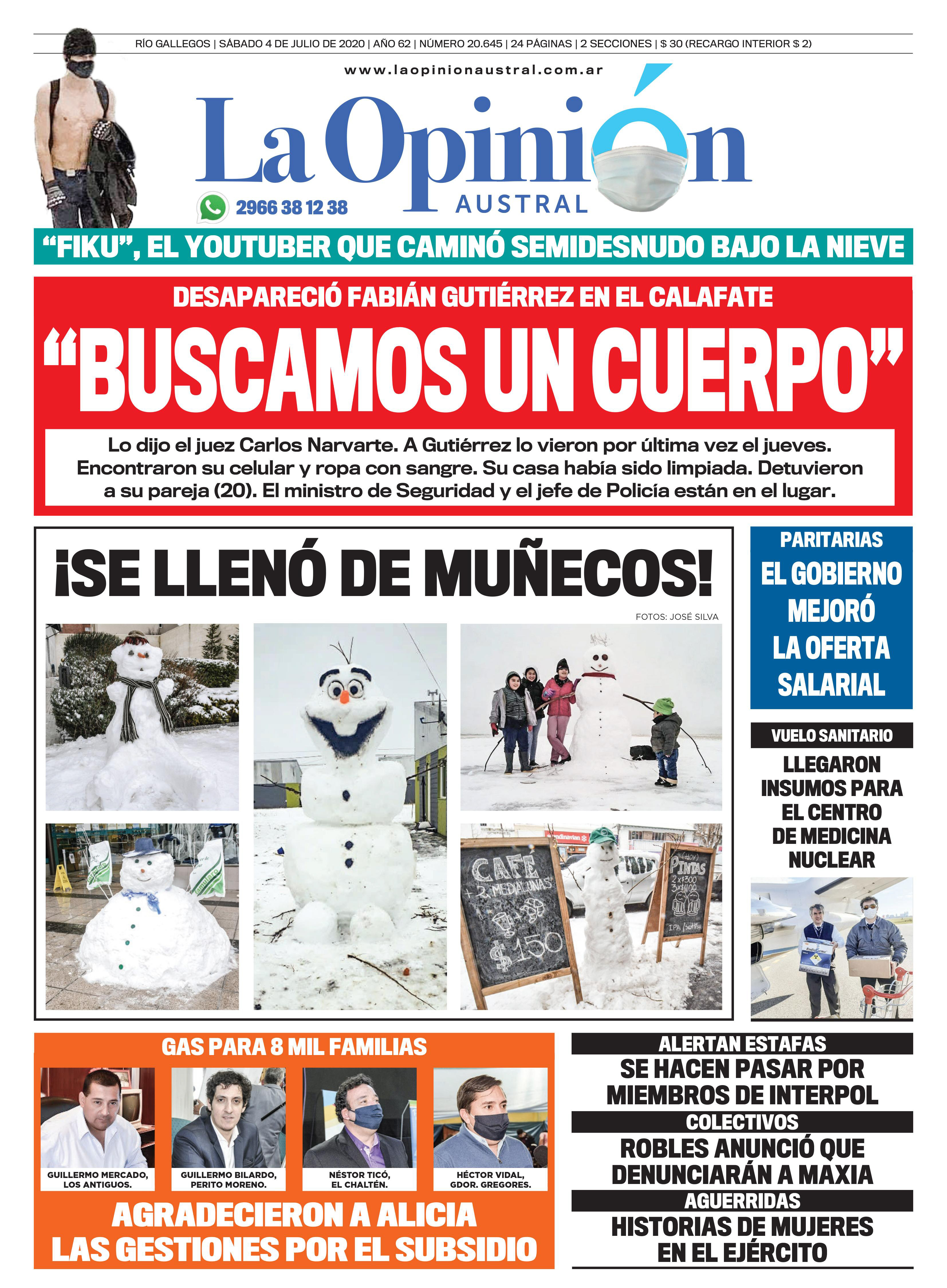 Tal es así, que esa misma noche el magistrado se arriesgó a remarcar ante la prensa local: “BUSCAMOS UN CUERPO” (NdR: así tituló La Opinión Austral en su tapa del 4 de julio del 2020). Es que los pesquisas descubrieron con luminol sangre por doquier en la casa del desaparecido. Además de encontrar ropa con sangre.