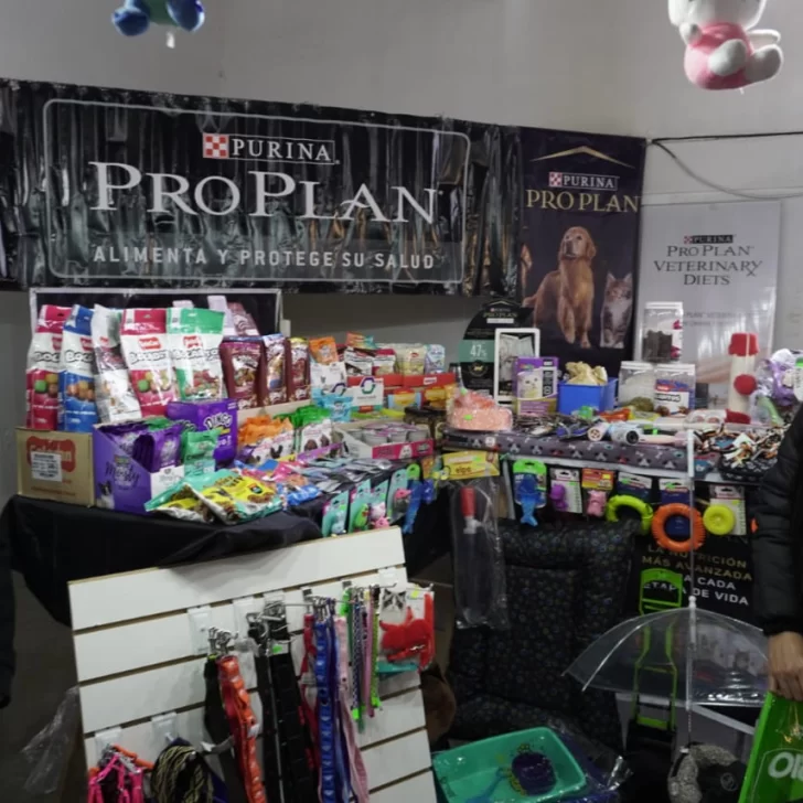 En el stand también ofrecen shampoo, antiparasitario, juguetes y la línea de alimentos Purina de la que son distribuidores oficiales.
