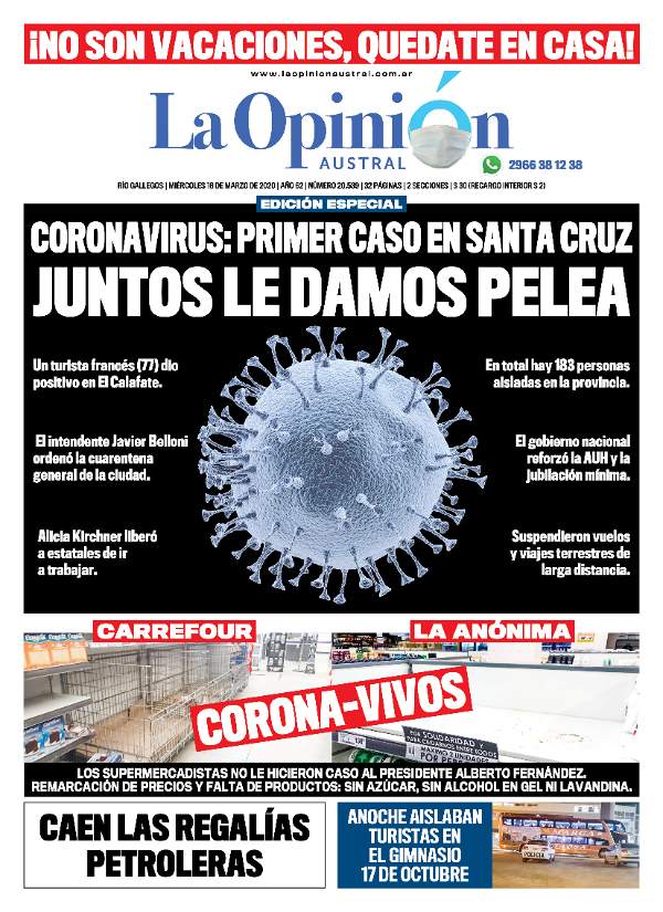 La tapa de La Opinión Austral del 18 de marzo del 2020 contaba el primer caso confirmado en Santa Cruz.