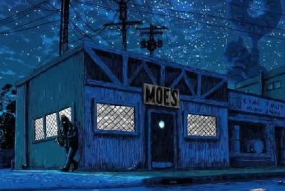 En otro dibujo se puede ver la Taberna de Moe con un aspecto más oscuro, en dos versiones: con un atardecer color fucsia, y otra con el cielo en plena noche. De fondo, la silueta de la estatua emblemática de “Lard Lad Donuts“, la tienda de rosquillas.