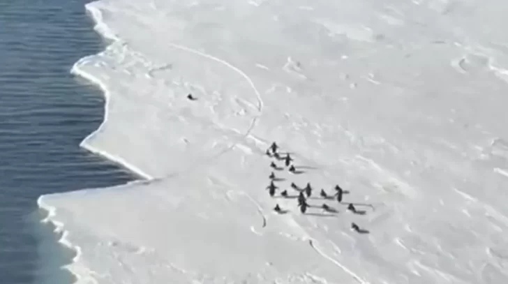 El ave iba tranquilamente caminando con otro grupo de su especie, cuando de repente la plataforma de hielo se quiebra y éste queda solo, separado de su manada.