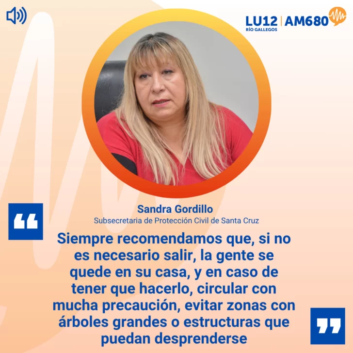 En Radio LU12 AM680 entrevistamos a Sandra Gordillo, subsecretaria de Protección Civil de Santa Cruz, ante la alerta naranja por fuertes vientos que afecta a Río Gallegos, Puerto Santa Cruz, Piedra Buena y San Julián. La funcionaria advirtió que las ráfagas podrían superar los 120 km/h y detalló el operativo preventivo desplegado junto a bomberos y distintos organismos.Además, brindó recomendaciones a la población, haciendo hincapié en evitar circular si no es necesario, extremar cuidados en zonas arboladas y mantenerse informados. También destacó el trabajo coordinado de los equipos de emergencia y recordó los canales de contacto ante cualquier eventualidad.