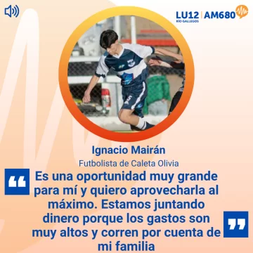 En Radio LU12 AM680 entrevistamos a Ignacio Marian, futbolista de Caleta Olivia que fue convocado para realizar una prueba en un club de Italia. La oportunidad llegó tras destacarse en una evaluación realizada en Gobernador Gregores, y representa un paso clave en su carrera deportiva.Sin embargo, el desafío no es solo deportivo: el joven necesita reunir entre 4.000 y 5.000 euros para cubrir pasajes y estadía durante 15 días. Por eso, junto a su familia impulsa distintas iniciativas solidarias y pide el acompañamiento de la comunidad para poder concretar el viaje previsto para el 23 de mayo.