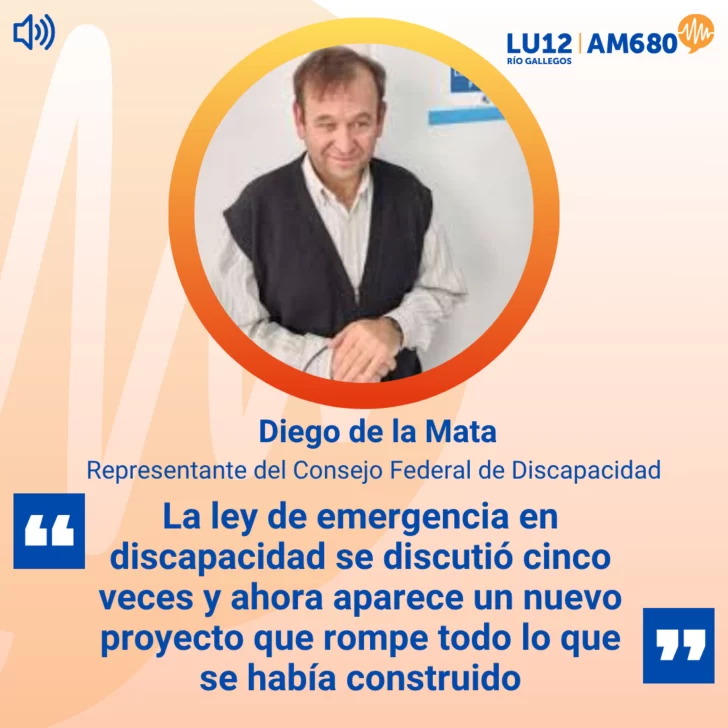 En diálogo con Radio LU12 AM680, Diego de la Mata, Representante del Consejo Federal de Discapacidad, cuestionó el nuevo proyecto impulsado por el Gobierno nacional y advirtió que podría desarticular el sistema actual de prestaciones.Según explicó, el atraso en los pagos, la falta de actualización del nomenclador y las auditorías sobre pensiones ya están generando interrupciones en tratamientos y pérdida de profesionales. Además, alertó que las medidas podrían trasladar la responsabilidad a las provincias, profundizando la crisis en el acceso a la salud para personas con discapacidad.