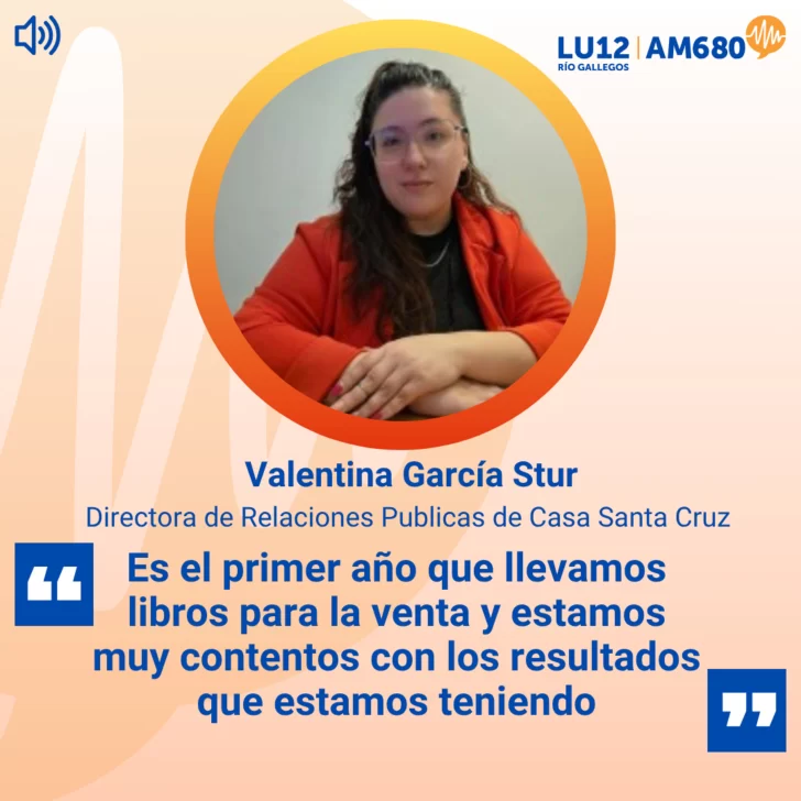 En el marco de la Feria Internacional del Libro de Buenos Aires, la provincia de Santa Cruz participa con un stand propio y una agenda cargada de actividades culturales, presentaciones y homenajes.En diálogo con Radio LU12 AM680, Valentina García Stur - Directora de Relaciones Publicas de Casa Santa Cruz , destacó el impacto positivo de esta presencia: ya se vendieron más de 70 libros de autores santacruceños en los primeros días y crece la curiosidad del público por la identidad cultural de la provincia.