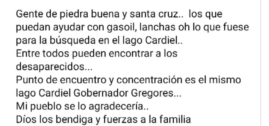 Vecinos del lugar indicaron que afortunadamente abrían encontrado al pequeño de 8 años y a su papá. Continúa la búsqueda para hallar a las demás personas. Advirtieron que solicitan colaboración de combustible (Gas Oil) porque en la estación de Gobernador Gregores no hay.
