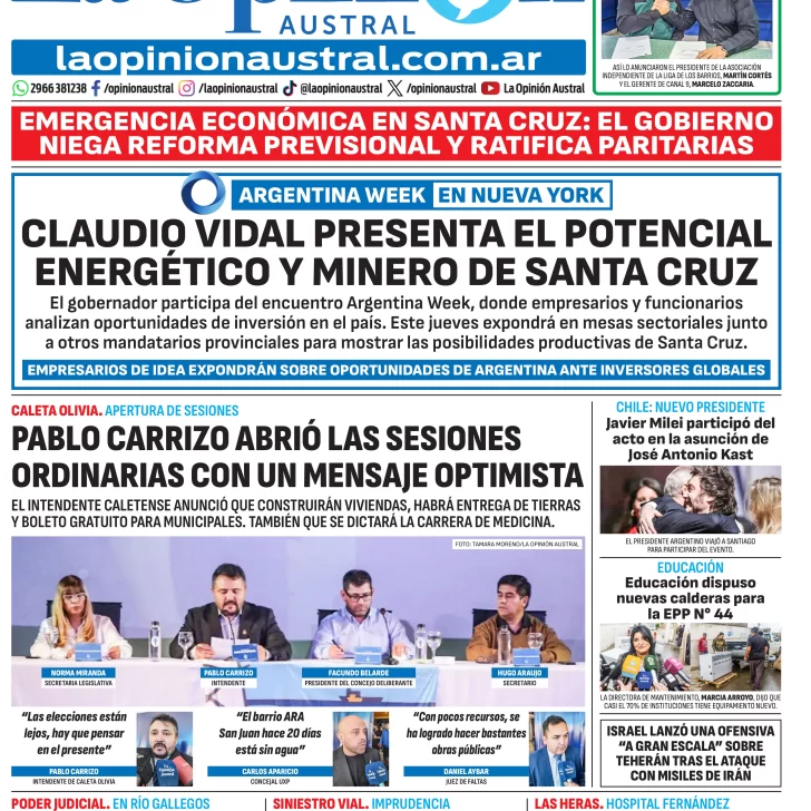 El intendente de Caleta Olivia, Pablo Carrizo, inauguró el período de sesiones ordinarias del Concejo Deliberante con un mensaje optimista. Entre los anuncios destacó la construcción de viviendas, la entrega de tierras, la implementación de boleto gratuito para trabajadores municipales y el impulso a la carrera de Medicina. “Las elecciones están lejos”, dijo después del discurso.