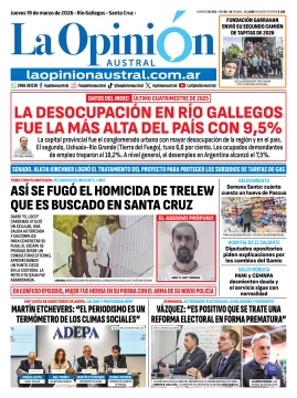 Tapa del Diario La Opinión Austral edición impresa del jueves 19 de marzo de 2026, Río Gallegos, Santa Cruz, Argentina