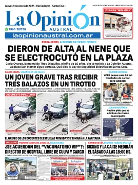 La Opinión Austral | La Opinión Austral | Tapas LA OPINIÓN AUSTRAL Tapa del Diario La Opinión Austral edición impresa del jueves 9 de enero de 2025, Río Gallegos, Santa Cruz, Argentina Por La Opinión Austral | 09 de enero 2025 · 7:03 hs. Escuchá la noticia Escuchá la noticia Your browser doesn’t support HTML5 audio EN ESTA NOTA Tapas Leé más notas de La Opinión Austral Compartir esta noticia WhatsApp Facebook Ver comentarios