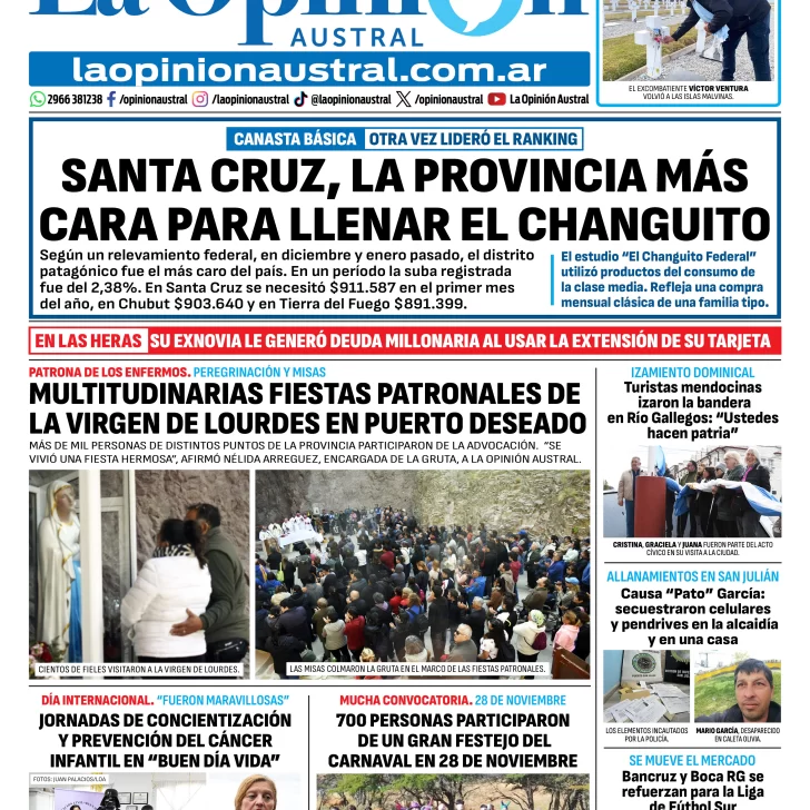 Santa Cruz, la provincia más cara para llenar el changuito. Exnovia le generó una deuda millonaria usando la extensión de su tarjeta. Multitudinarias fiestas patronales de la Virgen de Lourdes en Puerto Deseado. Turistas mendocinas destacaron el izamiento dominical de Río Gallegos.