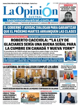 Tapa del Diario La Opinión Austral edición impresa del martes 26 de febrero de 2026, Río Gallegos, Santa Cruz, Argentina