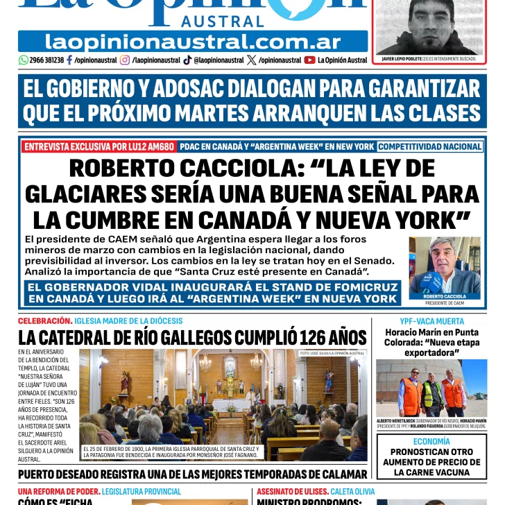 El gobernador Claudio Vidal inaugurará el stand de Fomicruz en la feria de la PDAC de Canadá y luego participará del “Argentina Week” en Nueva York. 126 años de la Catedral de Río Gallegos. El Gobierno provincial y ADOSAC dialogan para garantizar el inicio de clases el próximo martes. El gobernador Ignacio Torres presentó una reforma en la Ley de Pesca.