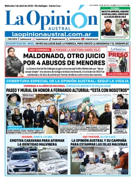 Tapa del Diario La Opinión Austral edición impresa del miércoles 1 de abril de 2026, Río Gallegos, Santa Cruz, Argentina