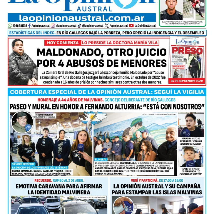 *Estadísticas del INDEC: en Río Gallegos bajó la pobreza, pero creció la indigencia y el desempleo * Homenaje a 44 años de Malvinas. Paseo y mural en honor al veterano de Malvinas Fernando Alturria: "Está con nosotros"