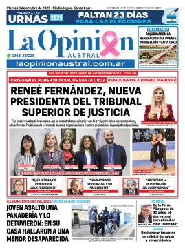 Tapa del Diario La Opinión Austral edición impresa del viernes 3 de octubre de 2025, Río Gallegos, Santa Cruz, Argentina