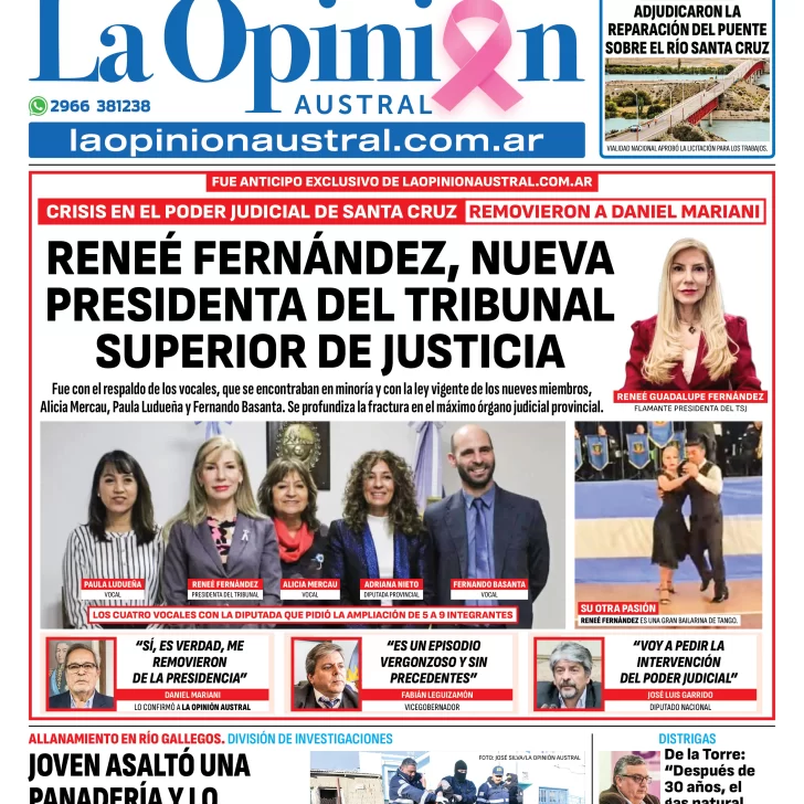 Crisis en el Poder Judicial de Santa Cruz, removieron a Daniel Mariani. Reneé Fernández, nueva presidenta del Tribunal Superior de Justicia. "Sí, es verdad, me removieron de la presidencia", aseguró Mariani. "Es un episodio vergonzoso y sin precedentes", dijo el vicegobernador Fabián Leguizamón. "Voy a pedir la intervención del Poder Judicial", José Luis Garrido, diputado nacional. Joven asaltó una panadería y lo detuvieron: en su casa hallaron a una menor. "Después de 30 años, el gas natural es una realidad en Pico Truncado", De la Torre, presidente de Distrigas.