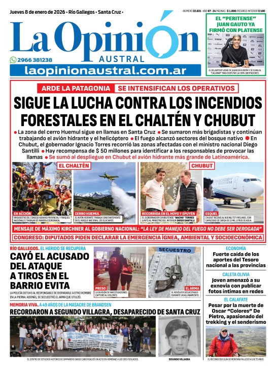 La zona del cerro Huemul sigue en llamas en Santa Cruz. Se sumaron más brigadistas y continúan trabajando el avión hidrante y el helicóptero. El fuego alcanzó sectores del bosque nativo.