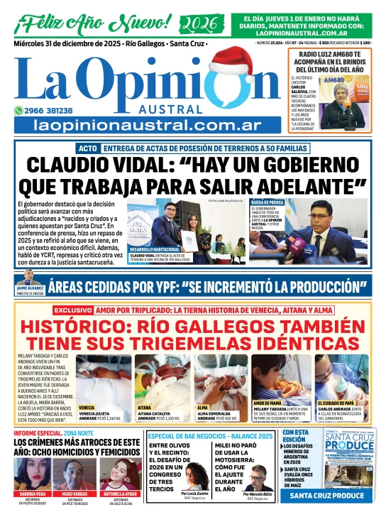 El gobernador destacó que la decisión política será avanzar con más adjudicaciones a “nacidos y criados y a quienes apuestan por Santa Cruz”. En conferencia de prensa, hizo un repaso de 2025 y se refirió al año que se viene, en un contexto económico difícil. Además, habló de YCRT, represas y criticó otra vez con dureza a la justicia santacruceña.