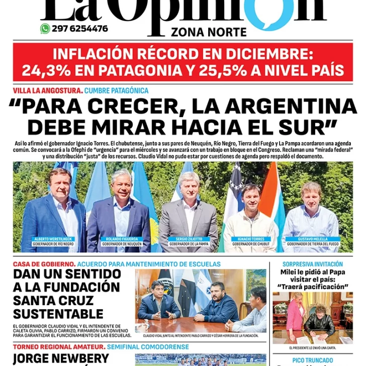 Así lo afirmó el gobernador Ignacio Torres. El chubutense, junto a sus pares de Neuquén, Rio Negro, Tierra del Fuego y La Pampa acordaron una agenda común. Se convocará a la Ofephi de “urgencia” para el miércoles y se avanzará con un trabajo en bloque en el Congreso. Reclaman una “mirada federal” y una distribución “justa” de los recursos. Claudio Vidal no pudo estar por cuestiones de agenda pero respaldó el documento.