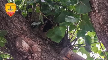 En el lugar, los efectivos desplegaron una escalera de mano para alcanzar al felino de manera segura y concretar la maniobra.