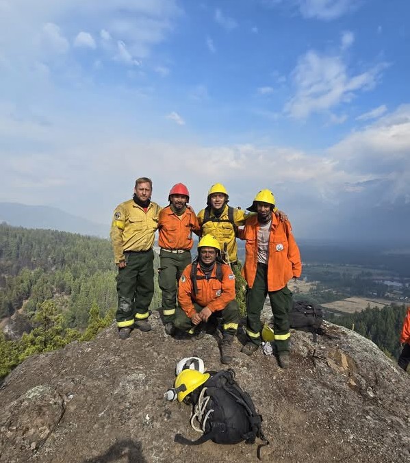 Mathias Méndez, Gustavo Montalvo, “Chispa” Cristian López, Marcos Morales y Roberto Sandoval son los cinco brigadistas de la localidad de Los Antiguos que integran la delegación de Santa Cruz que está colaborando en el incendio en la provincia de Chubut.